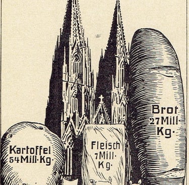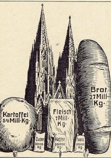 L'illustration ci-dessus illustre cette consommation plus clairement que ne le feraient les chiffres. Elle nous apprend que le pain que nos troupes consomment en une semaine équivaut à un veau géant presque aussi haut que la cathédrale de Cologne. La consommation de viande est illustrée par le bacon, celle de pommes de terre par la pomme de terre géante, et celle de café, de sucre et de sel par des sacs remplis, dont la taille devient particulièrement évidente lorsqu'on les compare aux petits personnages qui flânent devant eux. Ces quantités colossales sont obtenues semaine après semaine en achetant des marchandises en territoire ennemi ou chez nous.