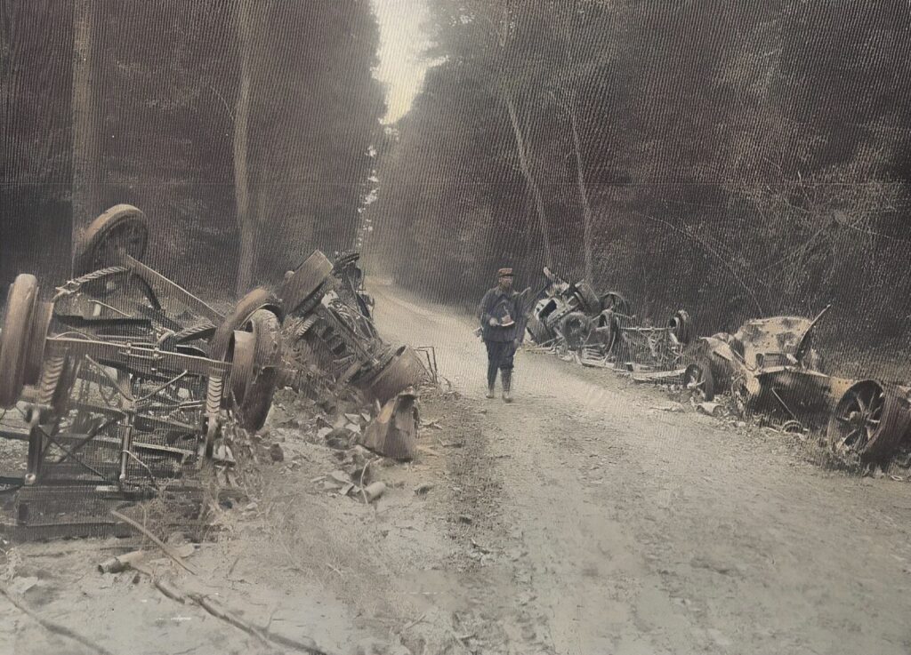 Sur la route de Soissons à Vilers-Cotterets, les dragons français ont rejoint au galop un convoi de camions automobiles allemands chargés de munitions. Une balle de mousqueton a abattu le conducteur de la première voiture. Les suivantes sont entrées en collision, ont pris feu et leur chargement a explosé. Il n’en reste plus que des débris informes.