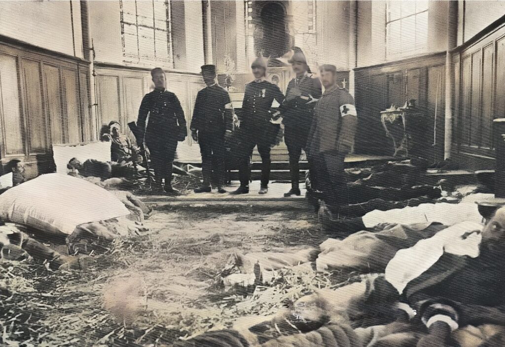 Dans l’église de Neufmoutiers, les Allemands avaient installé une infirmerie. Dans leur retraite, ils ont abandonné leurs blessés que les médecins français ont commencé à soigner.