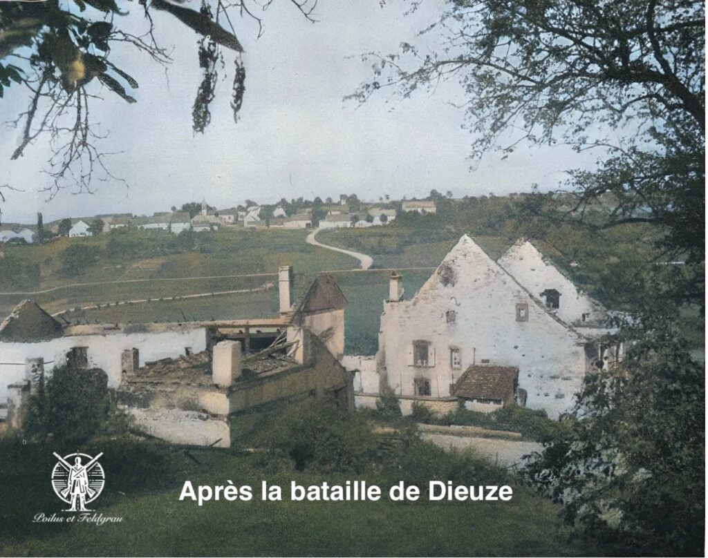 Huit corps d’armée français entre Metz et les Vosges furent repoussés. De la sorte que, grâce à une poursuite téméraire des troupes allemandes, ils durent se disperser et de retourner à leurs principaux points d’appui le jeudi 20 août. D’après notre informateur, nous étions à Chützengraben dans la nuit du 19 au 20 août, nous attendant à une attaque française à tout moment. Bien que des coups de feu aient été échangés de temps à autre, les Français n’ont pas avancé. Vers cinq heures et demie, l’ordre est venu de notre côté d’attaquer les positions françaises à l’ouest et à l’est de Dieuze.
