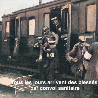 Le mercredi 19 août 1914, la Reine de Wurtemberg, consacra la première troupe hospitalière de l'Association régionale de Wurtemberg de la Croix-Rouge en présence du directeur Dr. Gener et le conseiller privé Herrmann, les deux plus hauts dirigeants du service médical volontaire du Wurtemberg, dans la cour de l’école en Souabe. Il y avait 41 hommes et 41 infirmières militaires qui ont été affectés cette mission. Notre couple royal a également porté un vif intérêt au train hospitalier annoncé par l'Association de la Croix-Rouge du Wurtemberg et qui est probablement en service depuis plusieurs jours. Il est destiné à être utilisé en permanence pour transporter les blessés entre la frontière et les hôpitaux locaux. Il se compose de 30 wagons. La grande majorité d'entre eux sont aménagés pour accueillir les blessés, chaque voiture dispose de 16 lits, qui sont accrochés aux longs murs sur deux étages superposés. Au milieu du train se trouve la voiture du médecin-chef avec la salle d'opération, avant et après se trouvent les voitures de l'administration, les médecins assistants et le personnel soignant. Les wagons-cuisines sont situés à la fin du train.