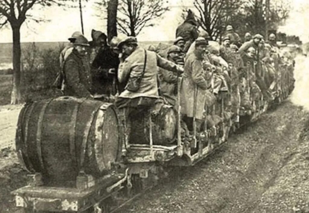 Ce ravitaillement se fait par le chemin de fer. C’est là un mécanisme compliqué puisqu’il s’agit de retrouver chaque jour des régiments qui changent de place. Pour résoudre ce problème, on a recours à la désignation journalière d’une gare de ravitaillement par corps d’armée. A cette gare, les trains régimentaires, c’est-à-dire les voitures attelées, se rendent chaque jour. Elles emportent deux jours de vivres, sur lesquels se fait la distribution journalière qui a été décrite plus haut. Comme il y a deux jours de vivres, il en reste un à distribuer, pendant que l’autre se renouvelle. Mais une difficulté peut surgir : l’interruption ou l’absence de voies ferrées. Dans ce cas, les convois automobiles remplacent le train. Autre difficulté à envisager pour une raison ou pour une autre, le chemin de fer ou les automobiles n’arrivent pas jusqu’aux troupes : dans ce cas on a recours aux réserves de vivres du corps d’armée ou d’armée.
