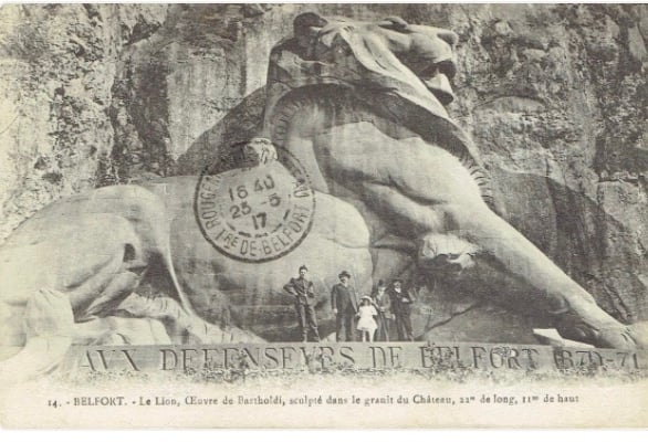 La fière Belfort, qui a résisté à tant de sièges jusqu'à présent, est dominée par la citadelle puissamment fortifiée, le "Rocher de Belfort", sur la pente abrupte de laquelle un lion a été sculpté en souvenir de la dernière et courageuse défense en 1871. Près de Montreux-Vieux, les Vosges descendent abruptement vers le sud. Le sentier nous emmène dans la vallée de la Doller allemande jusqu'au Ballon d'Alsace (1245 m). De son large dos on peut voir la belle vallée de la Savoureuse jusqu'au fort de Giromagny, Belfort et la fertile Franche-Comté. Au nord-ouest, s'étend le tout proche Ballon de Servance (1189 m), son sommet couronné d'un petit fort. Une belle randonnée sur les crêtes nous mène d'ici au Bärenkopf (1073 m) côté allemand, avec une large vue sur le fort du Ballon de Servance, le Ballon d'Alsace et Belfort. La crête allemande des Vosges du Sud revêt une grande importance stratégique en raison de sa situation favorable, qui deviendra probablement plus évidente au cours de la guerre.