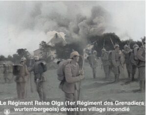 Lettre d’un militaire blessé qui envoie à son destinataire une pellicule de photos en lui faisant connaître la description de ses clichés. Stuttgart, le 10 septembre 1914. Ma chère cigogne ! (Mein lieber Storch !) Je suis resté indemne pendant plus de quatre semaines, au cours de huit batailles majeures et de nombreuses patrouilles difficiles,